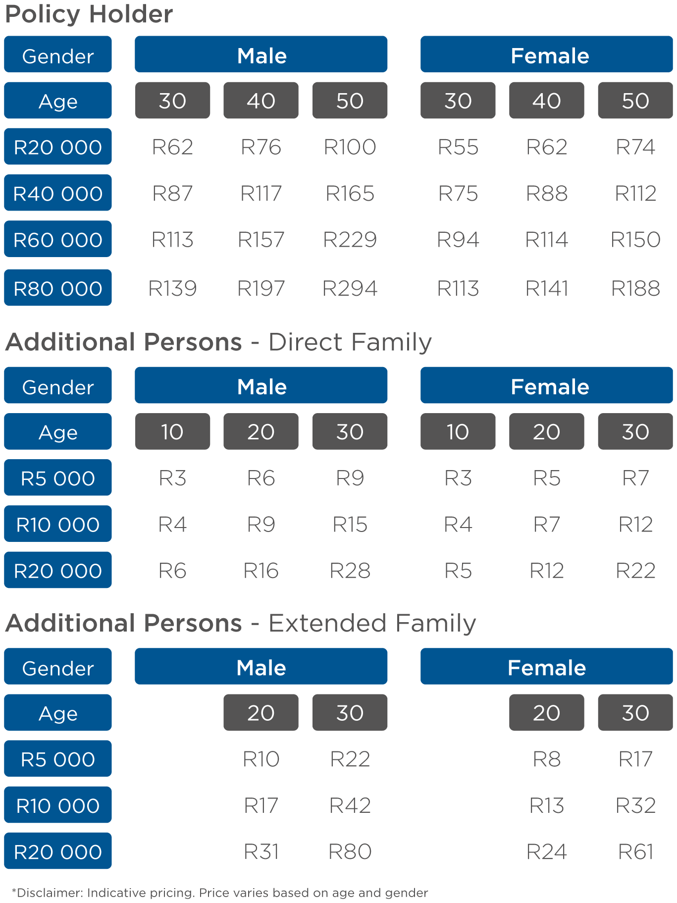 Inqaku Funeral Insurance premiums are calculated based on the age and gender of the policyholder and other people insured on the same policy.